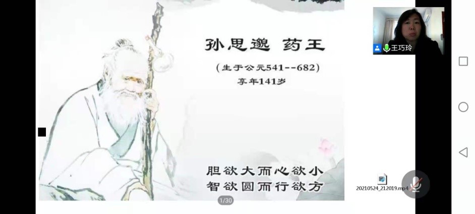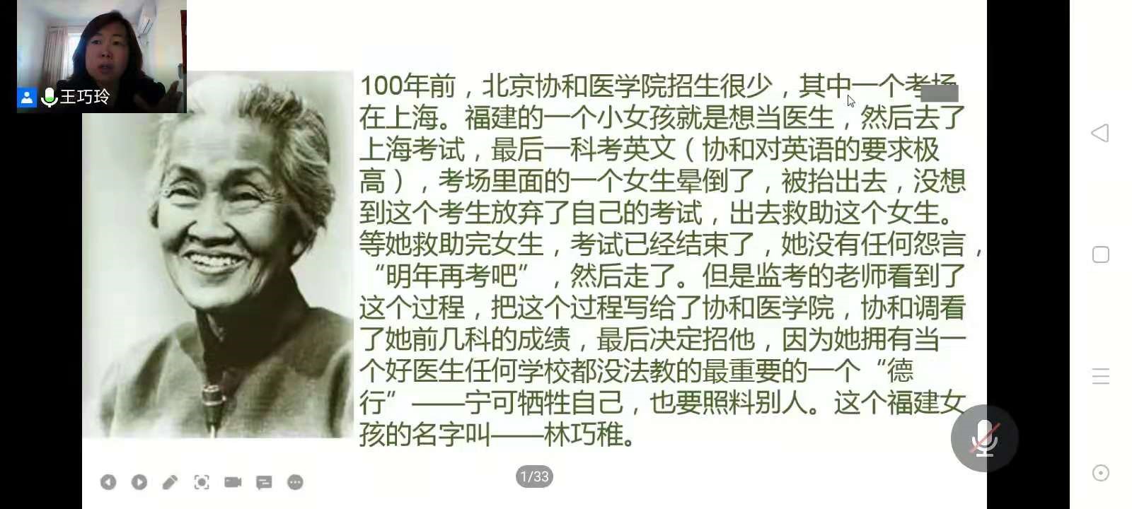 首先,王巧玲老师列举医者事迹:药王孙思邈的大医精诚;中国肝胆外科之父吴孟超心里始终装着病人,救死扶伤;钟南山院士,忠于祖国,热爱人民,关键时刻挺身而出;医护人员在疫情中奉献自我,奋斗在一线。